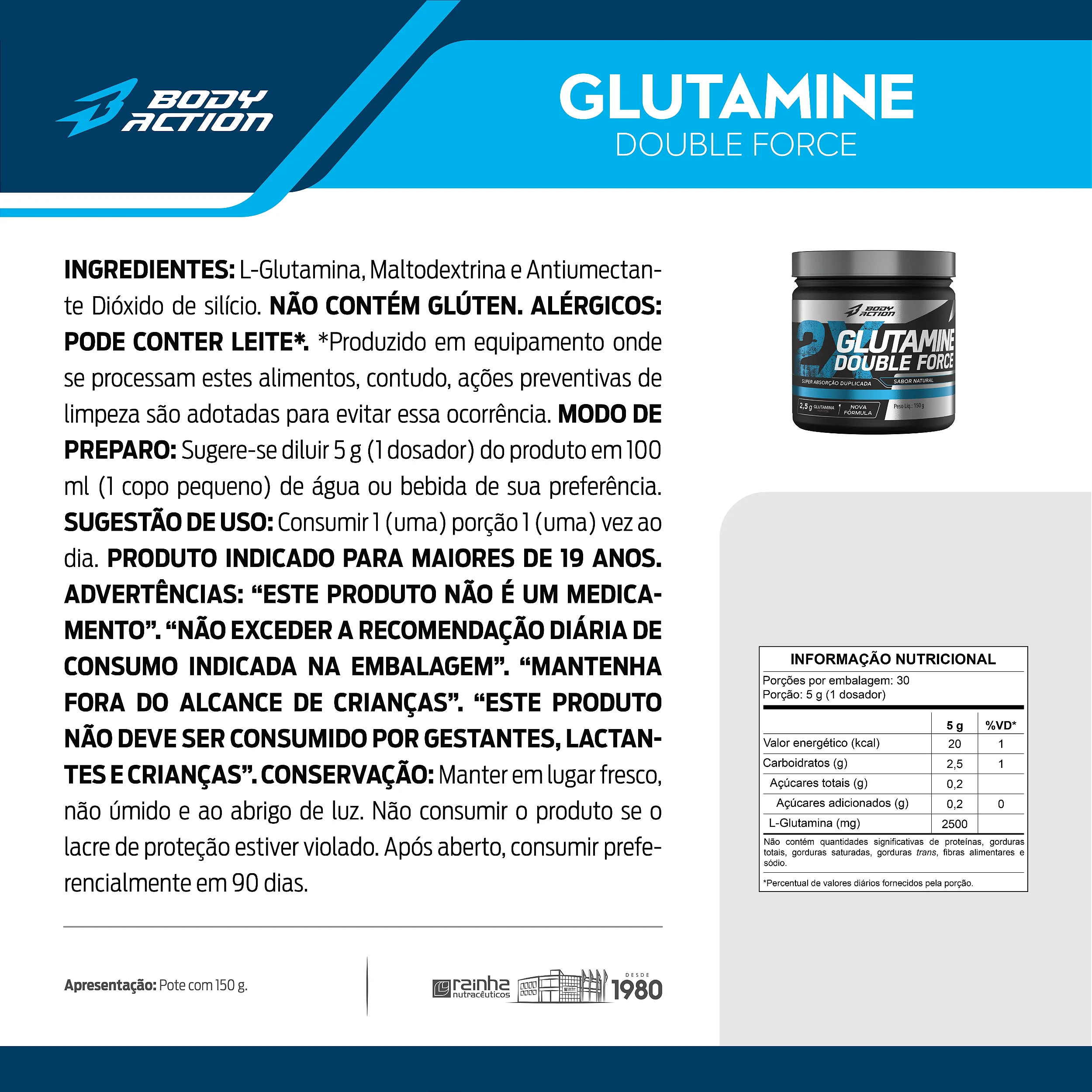 A Glutamina Double Force da Bodyaction é um suplemento alimentar que oferece uma dosagem precisa e eficaz para quem busca recuperação muscular rápida e aumento da resistência. Cada porção contém 2500 mg de L-Glutamina, ingrediente fundamental para a reposição de aminoácidos no organismo após exercícios intensos, ajudando na regeneração muscular e melhor suporte imunológico. Seu preparo é simples, bastando diluir uma colher dosadora em 100 ml de água ou bebida de sua preferência, facilitando a inclusão na rotina diária de suplementação. O produto vem em embalagem prática de 150g com 30 porções, ideal para uso contínuo e acompanhamento do resultado. Além disso, conta com baixo teor calórico, apenas 20 kcal por porção, e reduzido teor de açúcares, proporcionando um suplemento funcional para quem busca saúde e desempenho sem comprometer a dieta.